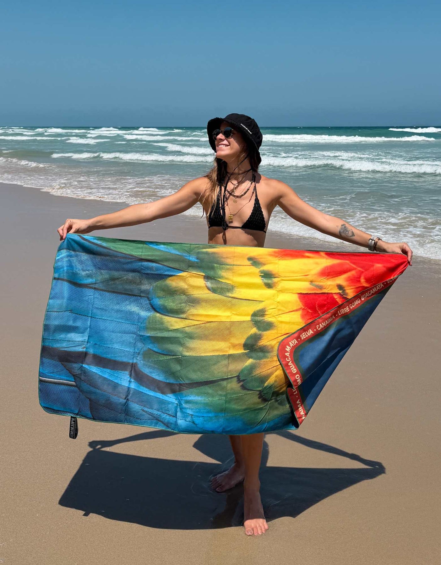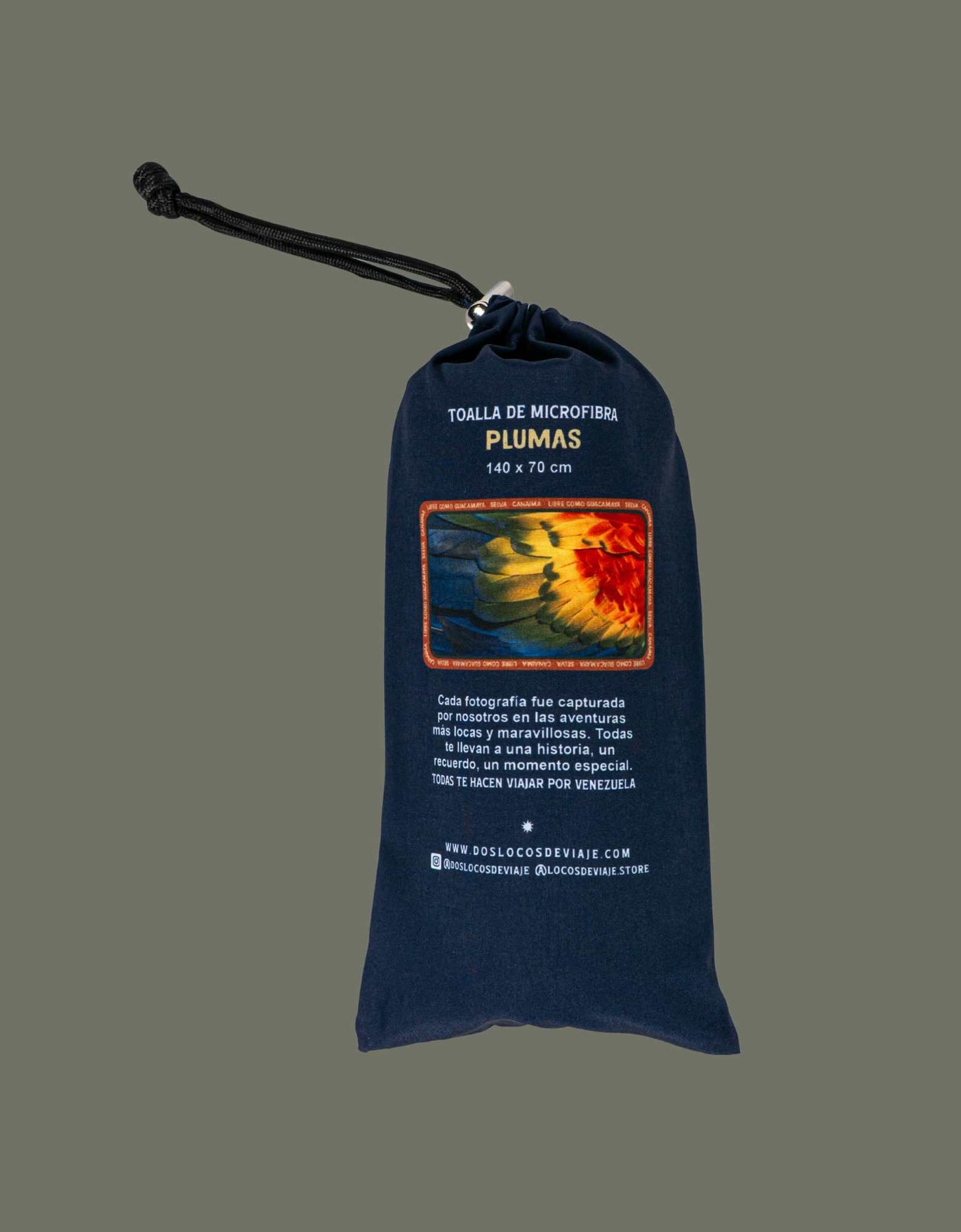 Toalla de microfibra impresa con una fotografía original de las plumas de una guacamaya bandera, capturada por nosotros. Ligeras, compactas y de secado rápido, son perfectas para viajar, la playa o cualquier aventura. Una pieza única que te conecta con la inmensidad de nuestras sabanas cada vez que la uses.